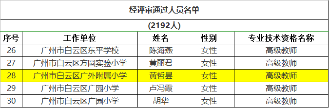 经广州市中小学高级教师任职资格评审委员会评审通过,下列同志拟取得高级专业技术资格,现予公示。若对下列同志取得资格有异议,请电话或书面向高级专业技术资格评审委员会办公室或人事职改部门反映,反映情况的电话和书面材料要自报或签署(手写)真实姓名,不报或不签署真实姓名的,一律不予受理。