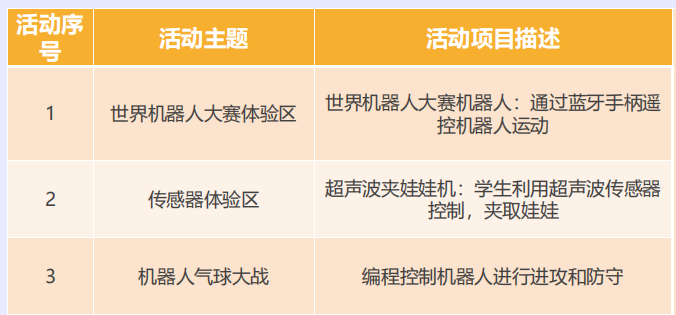 介绍项目: 1. 教师展示教学 2. —学生体验—小作品(钥匙扣带回家)每轮15分钟,可以同时15人体验 物料及人员需求: 1. 需要电源 2. 20张桌子和椅子 |