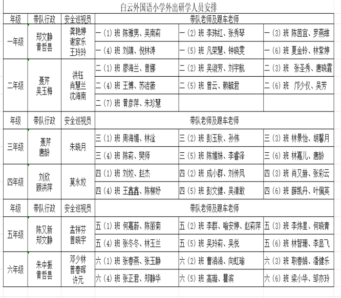 2.人员点名组:班主任及跟班老师。负责清点人数,确保人员全部到位。
