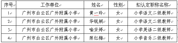 经个人申报和我校职称认定领导小组审核和讨论,拟同意黄一玲等4位认定专业技术资格(见附表),拟对其认定材料进行公示,其纸质申报材料将于2018年10月17日至2018年10月25日(不得少于7个工作日)在学校第一会议室进行公示。若对申报人材料有异议,请电话或书面向市、区、学校投诉受理部门反映,反映情况的电话和书面材料要自报或签署(手写)真实姓名,不报或不签署真实姓名的,一律不予受理。
