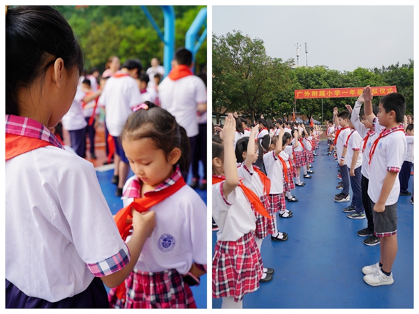 本网讯 5月24日一早,暖暖的阳光普照广外附小的校园,在蓝天白云和红红的队旗的映衬下,校园变得格外迷人。这是个值得纪念的好日子,这一天我们入队啦!你听,队歌激昂;你看,队旗飘扬。我们戴上了鲜艳的红领巾,成为了一名名光荣的少先队员!