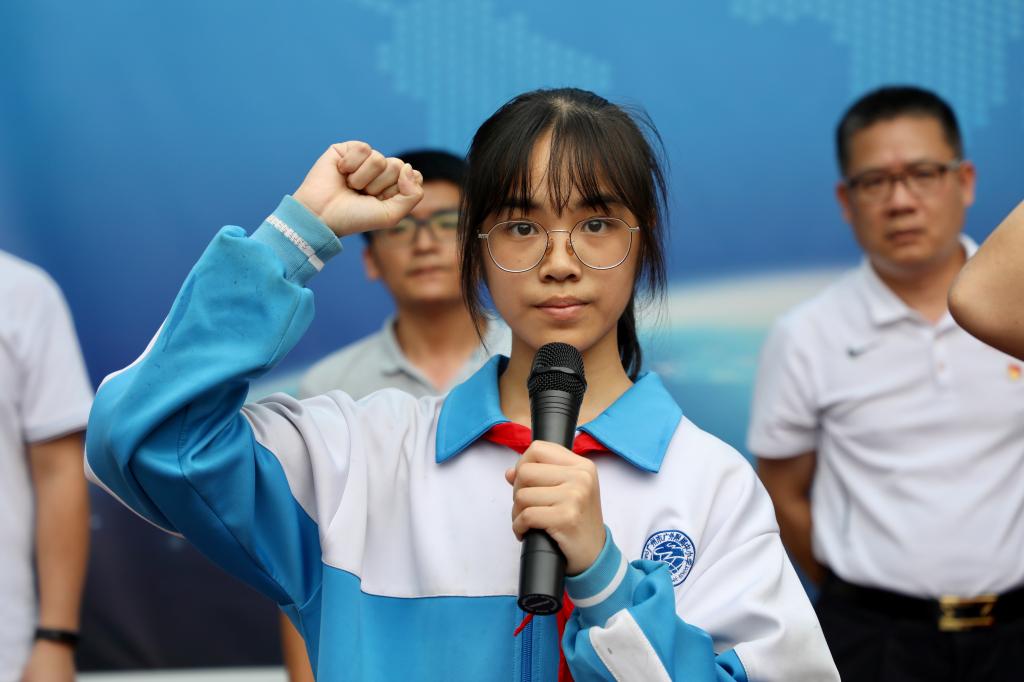 在这庄严的时刻,又有一批优秀的同学光荣加入中国共产主义青年团。团委书记王琪宣读名单并做讲话。他勉励的同学们争当优秀青少年,早日加入共青团,完成新时代赋予的历史使命。面对团旗,新团员举起右拳,庄严宣誓:我志愿加入中国共产主义青年团......嘹亮的誓言激励着在场的每位同学。