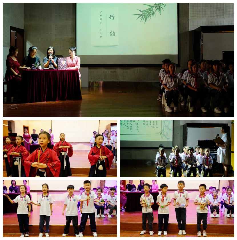 各班级的特色文化展示都是班级日常的缩影。首先上场的班级是三年级(3)班,他们以“Happy English Happy Class ”为主题向我们展示了班级学习生活中的点点滴滴,以及英语特色;其次是一年级(2)班以“努力做最好的自己”为主题,通过回顾的线索向我们展示了他们进入学校快乐成长的足迹与收获;紧接着的是二年级(2)班,以新颖独特的情景剧,30年后相遇回忆“竹韵”班的来历、班级管理以及当时在良好的班级氛围中成长的每一幕。