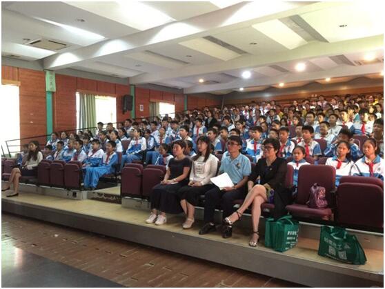 学生处林旭丽主任、张晓鹏副主任、初一级级长肖梅玲以及初一级全体师生认真聆听社工的讲解。