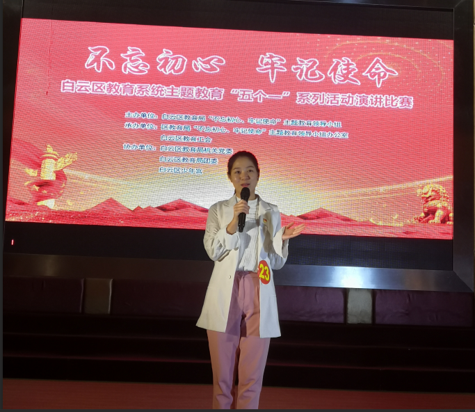 本网讯 我校王鑫鑫老师于11月8日下午参加白云区教育系统“不忘初心、牢记使命”主题教育“五个一”系列活动演讲比赛荣获第一名。