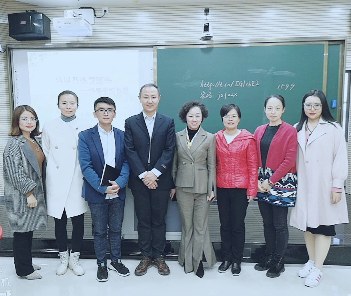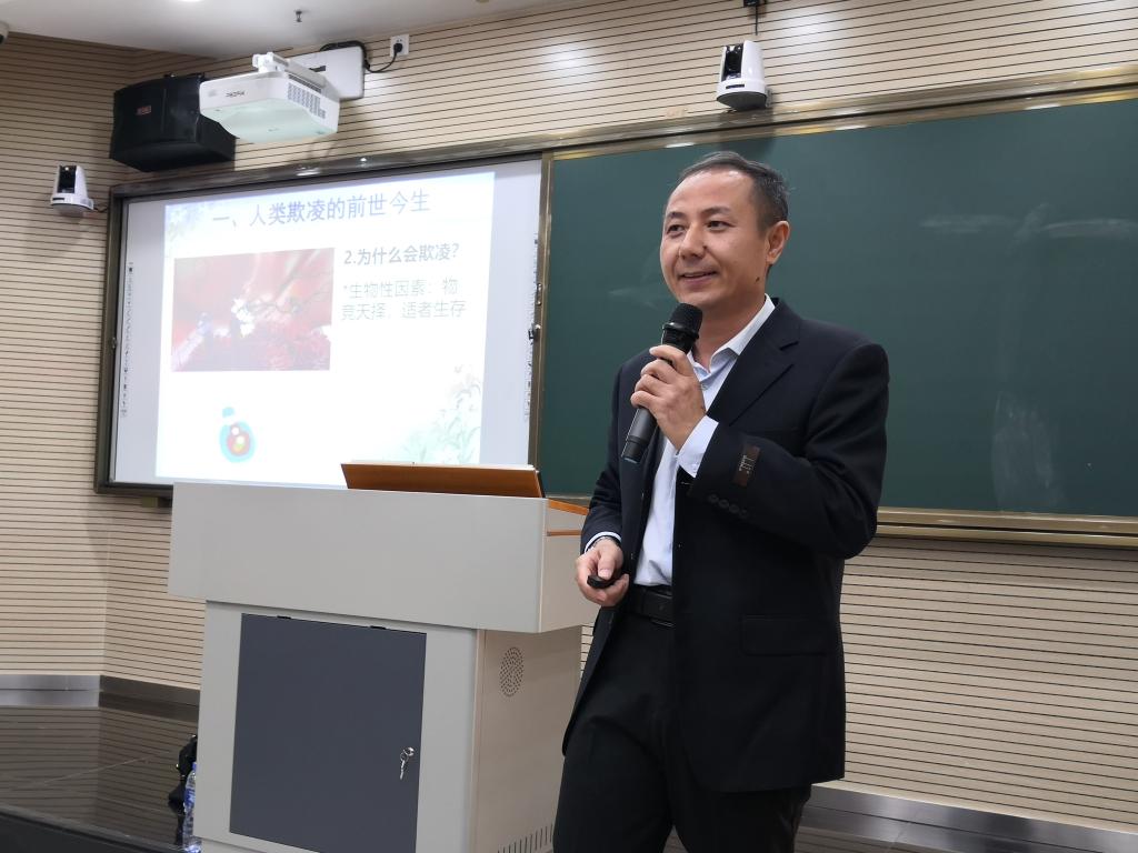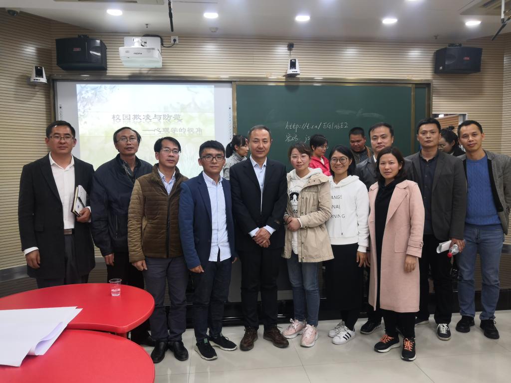 随后,朱海龙教授从心理学视角给全体班主任老师做了《校园欺凌与防范》的专题讲座。他从产生校园欺凌的生物学原因入手,深入浅出的阐述了校园欺凌的类型、特点、心理机制以及校园欺凌所产生的PTSD(创伤性应激障碍)后果,提出了面对校园欺凌,重要的是做好积极防御,他指出中国教育部2017年12月颁布《加强中小学生欺凌综合治理实施方案》以及广东省在2018年11月12日,出台《加强中小学生欺凌综合治理方案的实施办法(试行)》,对校园欺凌的分类、预防、治理等问题作出明确规定。通过法律的手段和途径来解决校园欺凌现象,让学校德育管理工作有法可依。