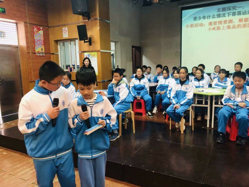 首先参赛的是冯文敏老师,她带着她所执教的初一(1)班,在一段毒品视频中拉开了班会课的序幕。本次班会主题为《珍爱生命,远离毒品》,既而通过学生自导自演的情景剧、小组分析演绎等众人参与的形式,探究分析出青少年容易沾染毒品的原因,以及面对毒品的应对措施,使禁毒观念深入人心。