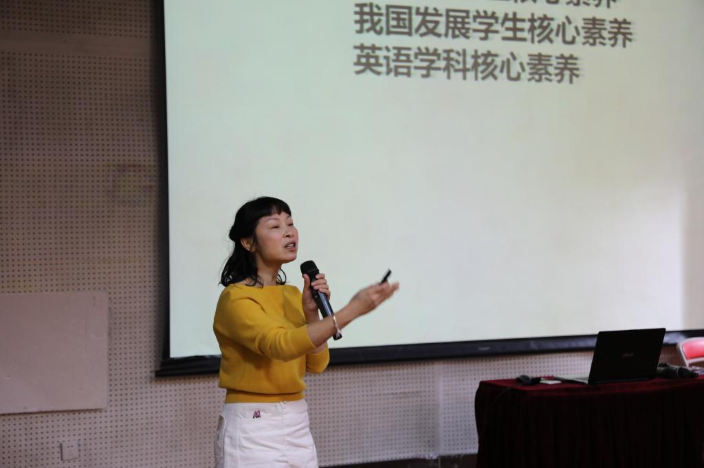 接着,谭丹丹老师对我校的英语课程设置进行了介绍,重点介绍了我校的特色课程——英语戏剧课。随后,广东省英语教研员王琳珊老师进行了主题为《基于活动观、指向核心素养的教学目标确定》的讲座。王老师深度剖析了新课程标准的内涵,同时阐释了如何制定教学目标才能真正落实英语学科核心素养。短短一个小时的讲座给我校老师们带来了醍醐灌顶之感。