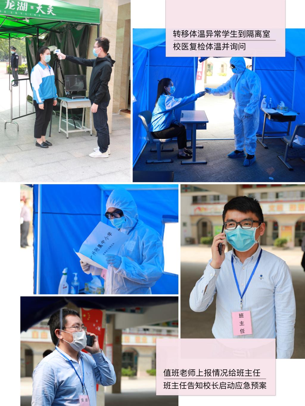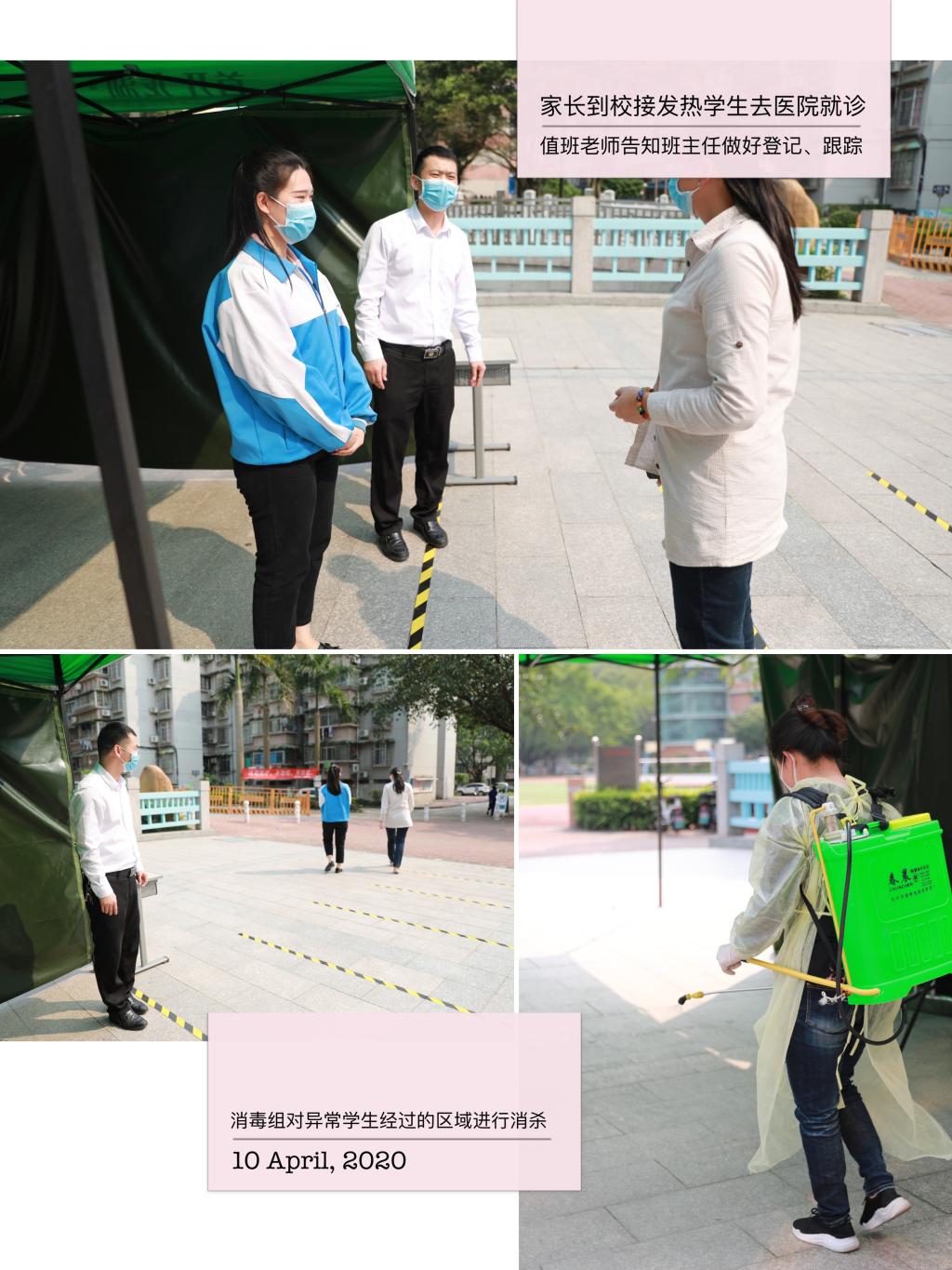 当发现有学生体温超过37.3℃时,值日教师第一时间将学生引导至校门口临时观察区进一步了解情况;由校医进行问询并做好学生安抚工作,如经问询得知学生只是一般的感冒发热,则班主任电话告知家长到校接学生去医院就医。如经问询得知该生曾到过疫情高发区或与疑似病例或确诊病例密切接触过又或是发热并伴有咳嗽、浑身乏力的情况,校医立即向学校疫情防控应急领导小组汇报情况,由应急领导小组启动学校疫情应急预案并上报黄石街道疾控中心和上级教育主管部门做后续处理。