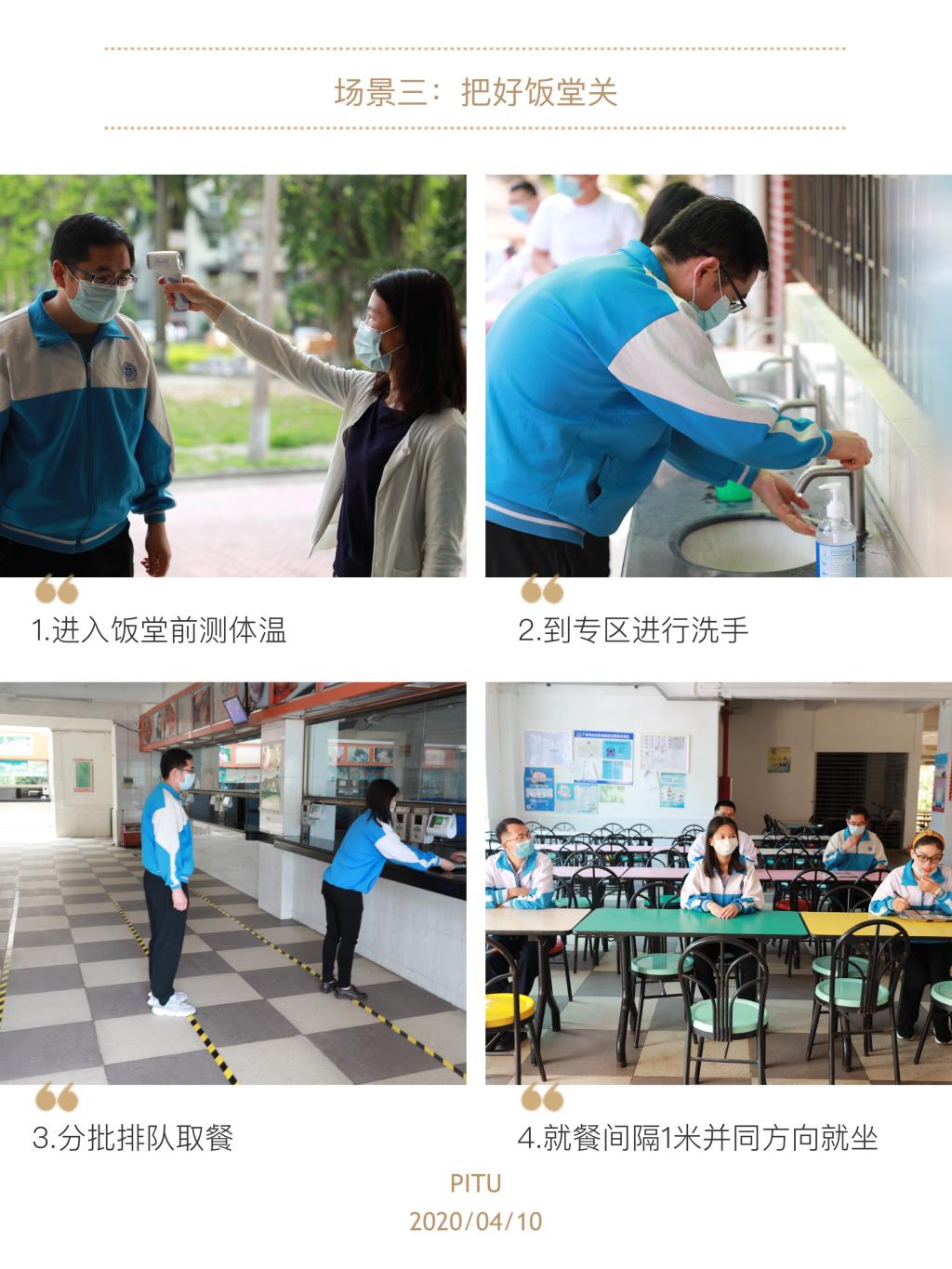 疫情防控期间,饭堂采用避免聚集、错峰取餐、分散用餐的管理模式。学生分批次排队,由值班教师带队,进食堂用餐。餐前洗手,指定位置就餐,学生就餐间距一米并同方向就坐。统一摘下口罩,用餐期间禁止交流,餐后及时戴好口罩,整理餐具放置指定位置后有序的返回教室。饭堂在用餐后统一进行消毒。
