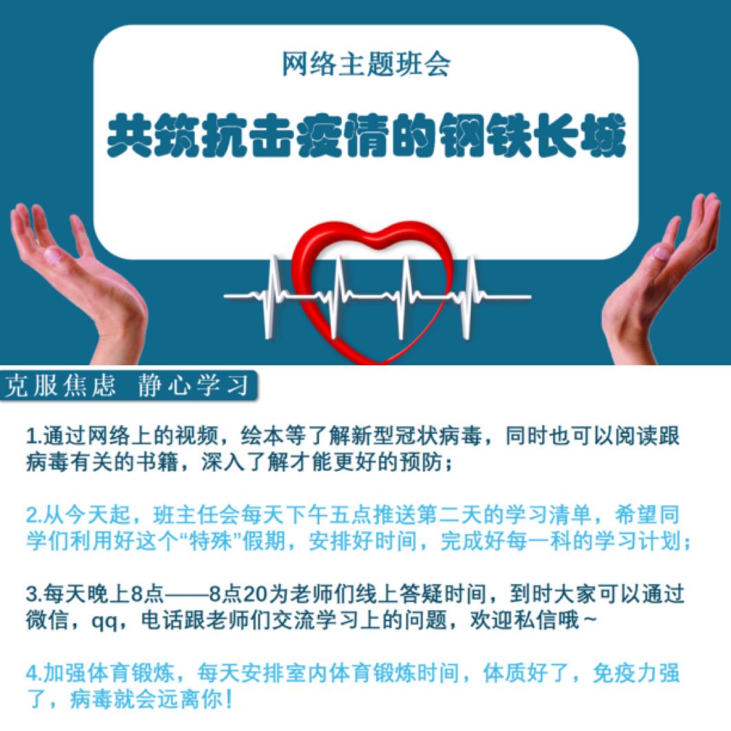 2月17日上午九点半,各班主任老师准时借助网络开展了特殊的“开学第一课”。通过推送观看时事新闻、短视频,讲解中央、省市区防疫政策,让学生学习、了解新型冠状病毒感染肺炎的诱因、传播途径、当前疫情的严峻性以及防疫的重要性和措施等内容。同时,向学生们讲述了疫情中无数医护工作者“舍小家顾大家”的感人事迹。介绍中国在抗击疫情期间所做出的巨大努力和中国人民在疫情面前所形成的磅礴力量,学生理解了“一方有难,八方支援”和“疫情无情人有情”,培养了学生的爱国热情。