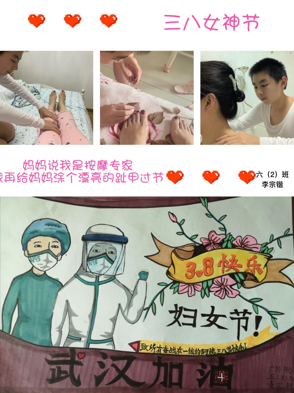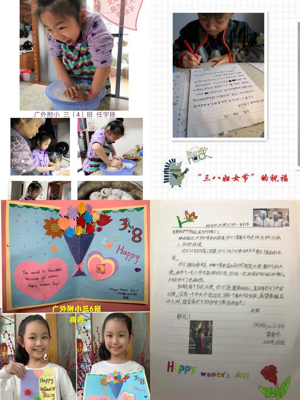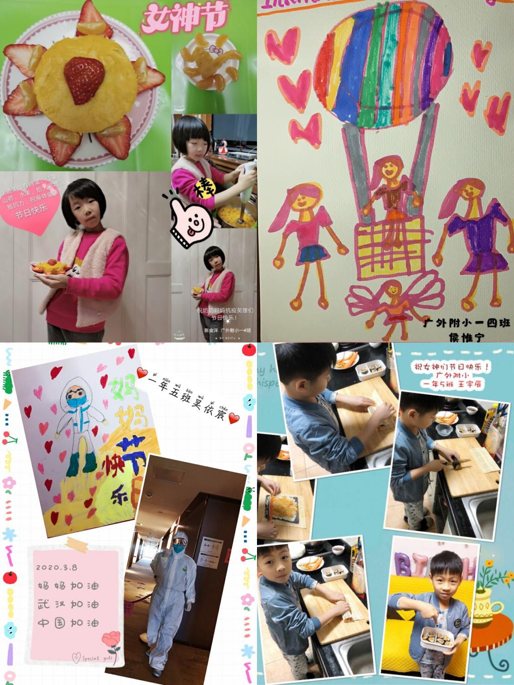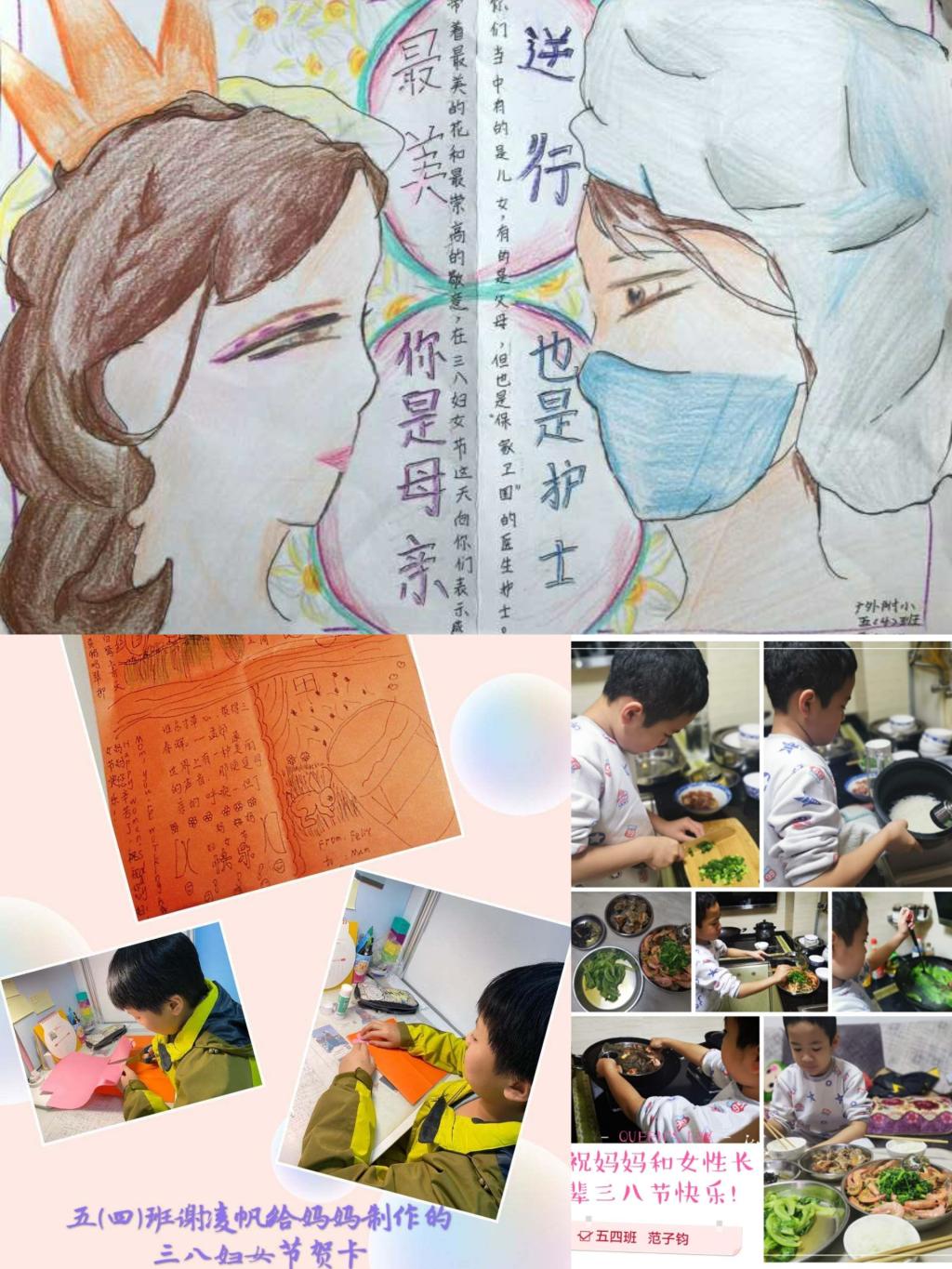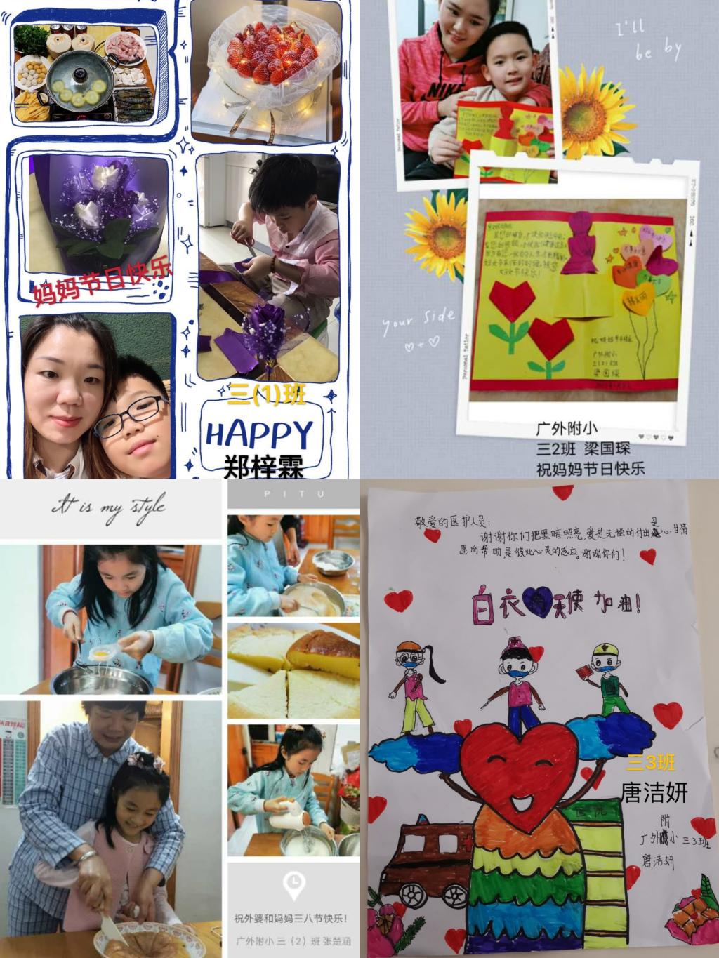 三年级同学亲手制作了爱心贺卡,用七彩的画笔、真诚的话语表达自己对妈妈、奶奶和外婆的爱,以及对抗疫女性医务人员的敬佩。