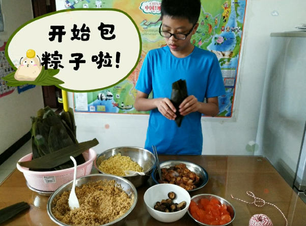 五、六年级学生跟长辈学习包粽子的技法,在学习的包粽子过程中,尝试和品尝不同地方、不同风格、不同特色的粽子。