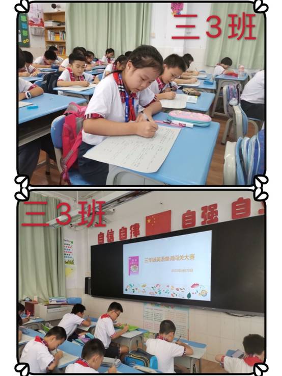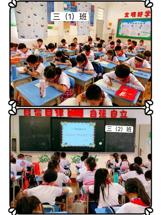 本网讯 6月30日,广外附小三年级同学们举行了一场英语单词闯关大赛。这次大赛结合了广州版教材单词和朗文版教材单词,采用单词分类的方式进行,并且加入了动词过去式的变化的内容,试卷有一定难度。同学们拿到卷子就开始认真做题,有的同学一边做一边微笑;有的同学碰到了不会写的单词也在抓耳挠腮,有的同学陷入了沉思,都希望能把每一个单词都写出来。英语词汇积累是英语学习框架的地基,只有扎实的机会基础才会学得更好,走的更远。我想孩子们这么认真的学习态度,在小学期间一定能打下良好的英语基础。这次比赛最终根据各班成绩,评出班级一二三等奖:一等奖3名,二等奖6名,三等奖10名。