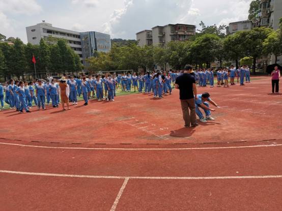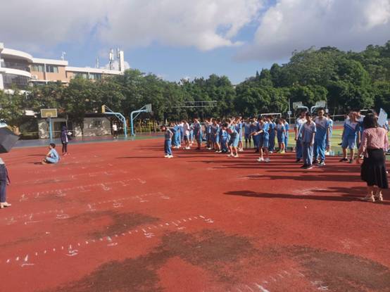 本网讯 7月7日是高考的日子。我校也迎来了本学期区的体育统测。时间在7:40-9:10是初二年级的体育抽测。内容:立定跳或三级蛙跳和1000米男生、800米女生。初一年级抽查时间10:00-11:00.内容:200米和立定跳或三级蛙跳。在全体的正副班主任和体育老师的组织下,学生有条不紊的、井井有条的进行考试。考试现场安静、有序。受到监考老师表扬、肯定。