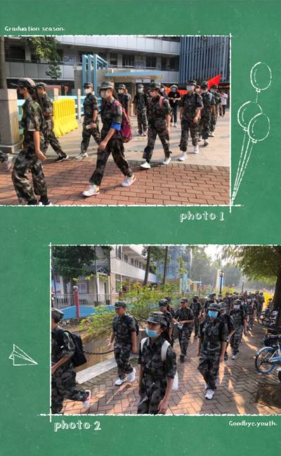 午休后,列队训练正式开始。芒果树叶和绿色的迷彩服相互辉映,显得活力十足。