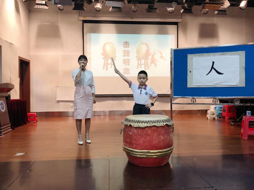 一年级级长邝少仪老师带领一名学生击鼓鸣志。一击鼓:始学破蒙,启智识礼;二击鼓:经典同行,知书明理;三击鼓:明德尚行,学贯中西。少年强孩子则国强,祝福孩子们实现自己的梦想,成为广外附小的骄傲。