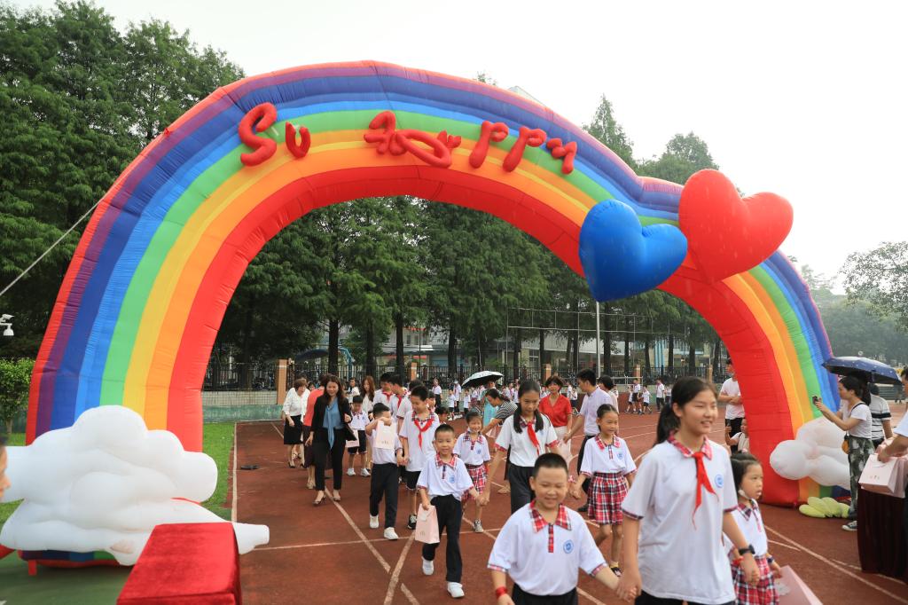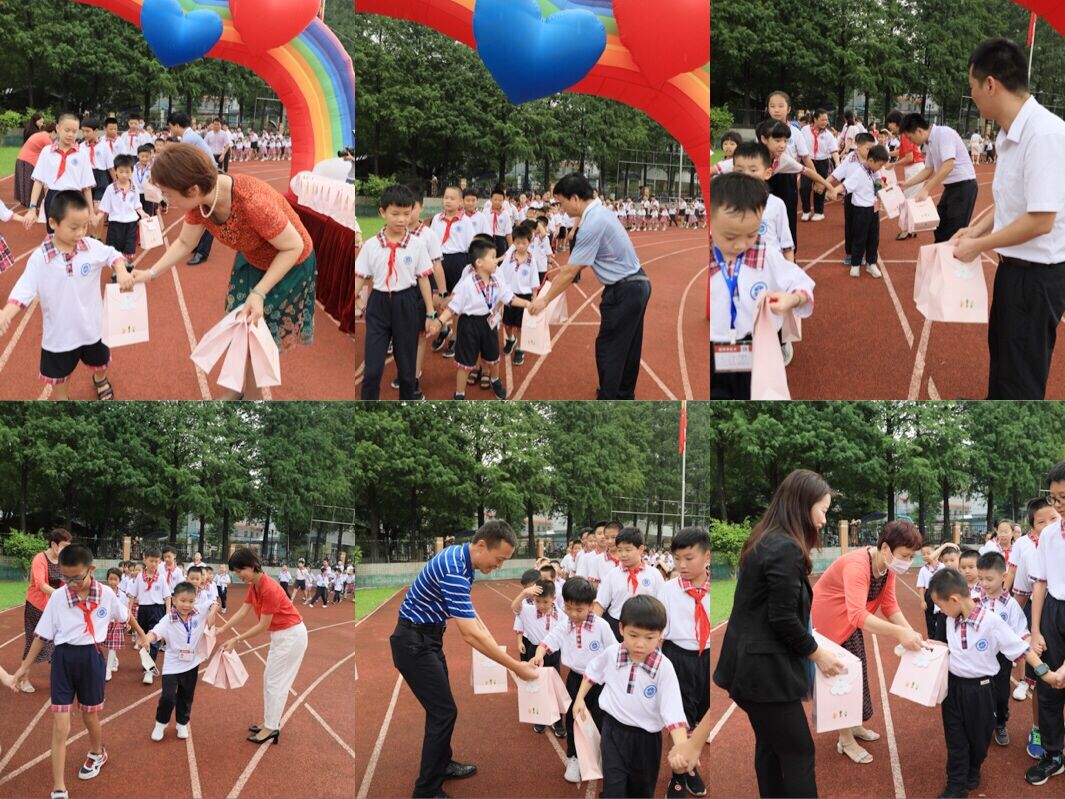 童蒙之学,先正衣冠,后明事理,同学们在六年级哥哥姐姐的带领下,一个个精神抖擞,神采飞扬,地穿过彩虹拱门。 学校领导为每位新同学派发了一份精心准备的“希望大礼包”——一根跳绳,希望同学们坚持锻炼身体;一枚书签,希望同学们以书为友,养成良好的阅读习惯;一颗棒棒糖,每位同学要努力做最棒的自己。