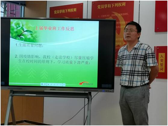 新学期开始,学校高度重视毕业班工作,在学期初的工作计划中就安排了此次会议。本次会议的主要目的是分析和梳理上届初三毕业班工作得失,交流和传承宝贵经验;立足本届学情,确立中考目标,探寻适合本届初三毕业班学情的工作方法。
