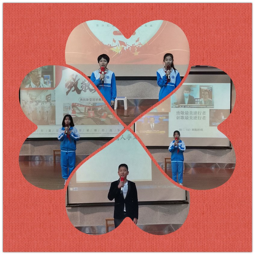 本年级十位选手一路在初赛、复赛等环节中过关斩将,最终脱颖而出成功晋级决赛。决赛在初二4班曾子堂、吴依蔓两位主持人精彩的介绍中拉开帷幕。比赛中,选手们的演讲声情并茂,时而慷慨激昂,时而情深意切,他们用敬意赞美逆行的抗疫英雄,用真情歌颂伟大的民族脊梁,情感真挚动人,表达通顺流畅,台风大气稳健。此次比赛选手们的演讲形式丰富多样,尤其是初二3班的组合形式,为本次比赛增添了一抹亮丽的色彩。十位选手用他们极具感染力的演讲,给大家带来一场视听盛宴,引起了在场观众们的感动和共鸣,博得了潮水般的掌声。