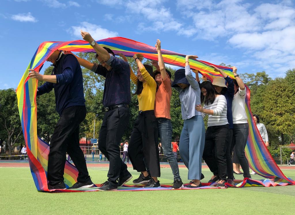 “同舟共济”是团队协作型户外游戏,老师们穿上特制鞋板走向终点,用时最短的队伍获胜,主要考验同事之间的配合力、默契度和团队意识。