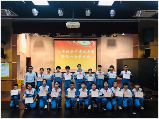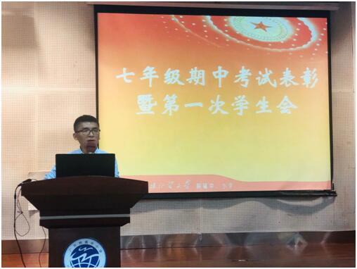 级长靳保玉老师首先表彰了期中考前30名及每个班进步最大的5名学生,学生处副主任张晓鹏老师为他们颁发了奖状,同学们光荣地上台领奖合影。