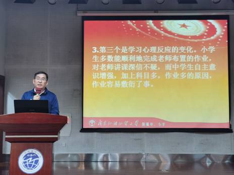 首先发言的是靳保玉级长,他回顾了学生们进入中学以后参加的各项活动,对同学们的表现给予很高的评价。他还谈到进入中学后学生们的变化,并给家长们提出了几点与学生沟通的建议。