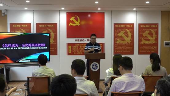 英语科组的张迪新老师接着从《怎样成为一名优秀英语教师》一书中分享了自己的感悟,他关注到任务型教学过程中存在的问题以及如何在教学中布置有开放性、趣味性和交际性的真任务,这对很多老师都有着指导意义。张老师在分享最后赋诗一首以表达自己的教育情怀:“廿载为师一书成,百年育人万字金,天下英才欲无尽,台上语言须有心。”