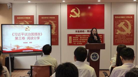 第三位是由来自体艺组的黄婧老师进行分享,她同样阅读了《习近平谈治国理政》第三卷,从自身作为团委书记的工作实际出发,向各位展示了书中的用典智慧,其中“不要人夸颜色好,只留清气满乾坤”这一典故更是让她在工作中指导学生不要在意他人评价,专注做好自身工作。由阅读生发思考进而在工作中实践,值得学习。