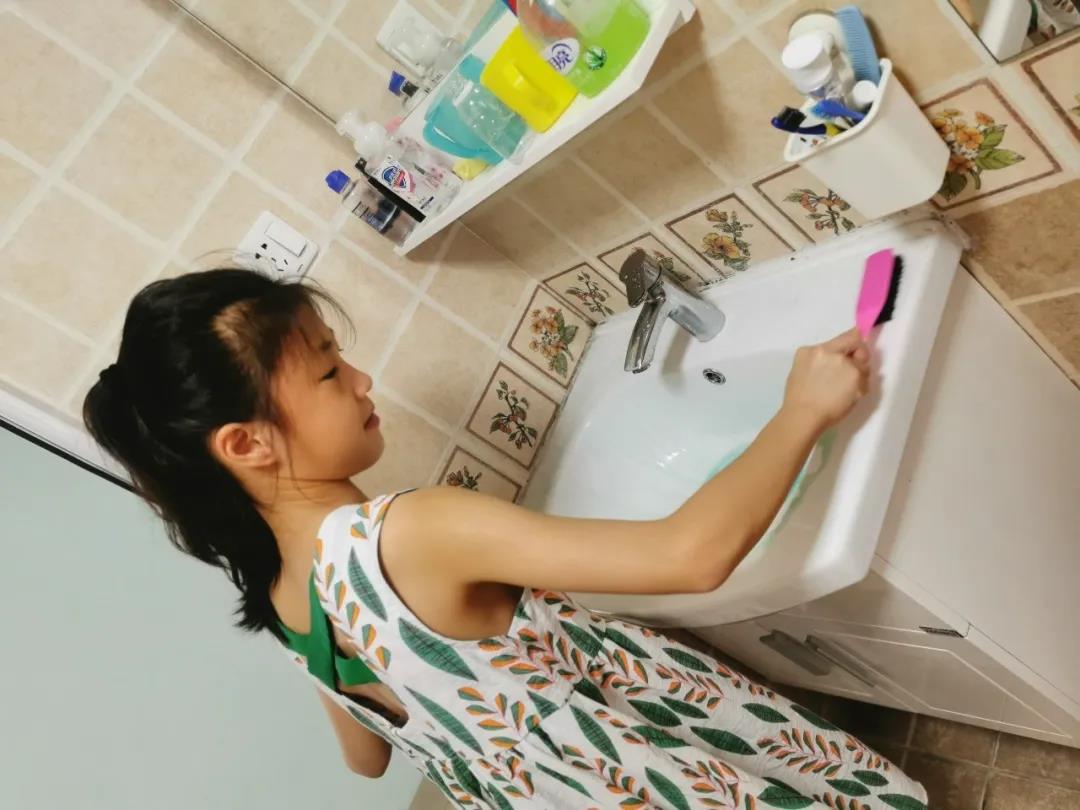 我是李欣妮。今天,妈妈给我分配的任务是清洁洗漱台与洗碗。看似简单的两个活其实并不轻松。洗漱台角角落落的积尘很难用水清理,在爸爸给我变出“魔力清洁剂”之前我可是费了很大力气都没能将它清理干净。洗碗同样不简单,对于一些较大的碗我花很大力气才能拿稳清洗。不过这些都在妈妈的指导下顺利完成了。看着我亲手打扫与清洗干净的洗漱台及碗筷,我的内心充满了成就感。同时我也体会了劳动的辛苦,我暗下决心,以后要多帮妈妈分担家务,分担辛苦!