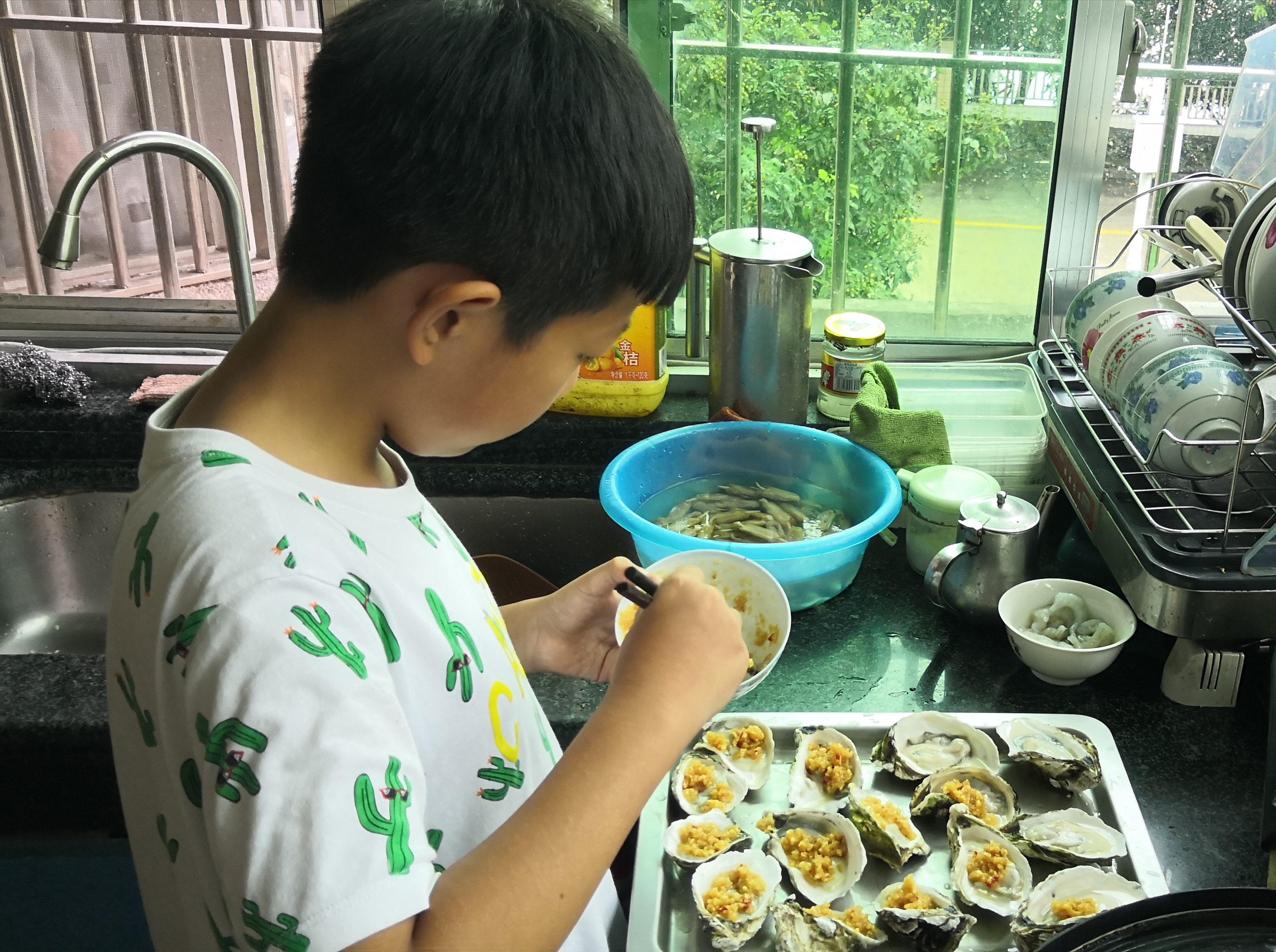 我做的是烤生蚝。烤生蚝首先要将生蚝洗干净;然后剁碎蒜蓉和姜末,并与酱油调和在一起;接着放入生蚝内,放入烤箱。20分钟后,香喷喷的生蚝就上桌啦!