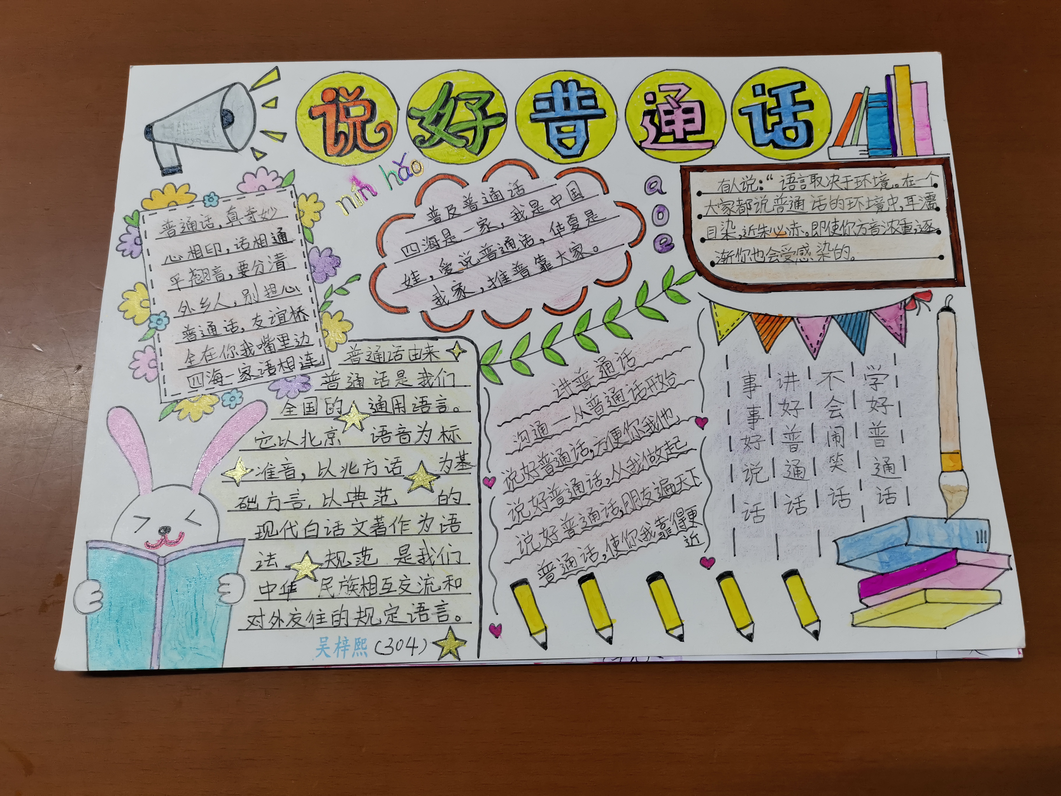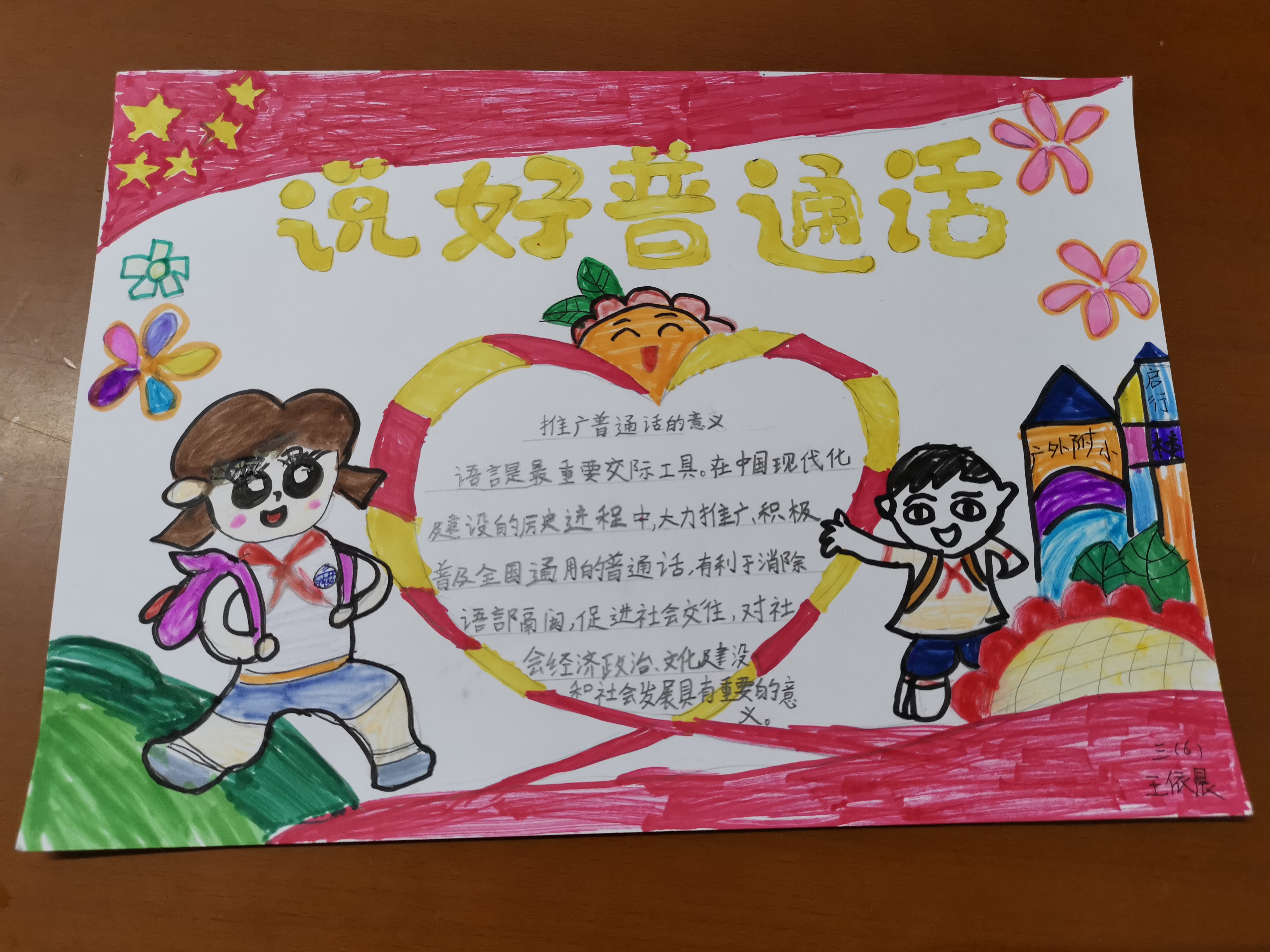 说好普通话,迈进新时代。三年级学生动手制作了精美的读书卡,号召全校师生说一口标准文明的普通话,写一手规范漂亮的汉字,让我们每天都能在抑扬顿挫中感受普通话的魅力,在横平竖直中欣赏汉字的风采。