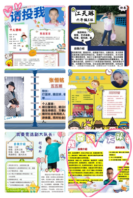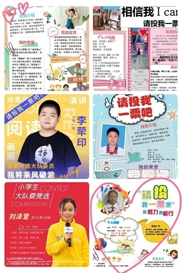 本次竞选流程共五部分:少先队员自主报名——个人宣传海报——竞选演讲——现场答辩——师生民主投票。最终挑选出十七位优秀少先队员担任新一届大队委干部。