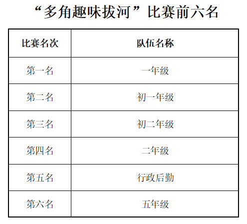 通过2轮火热比拼,最终行政后勤组用时12秒75获得“同舟共济”冠军,六年级、初三年级、四年级、初二年级、二年级组分别获得2—6名;经过9场激烈角逐,一年级组获得多角趣味拔河冠军,初一年级、初二年级、二年级、行政后勤、五年级组分别获得2—6名。