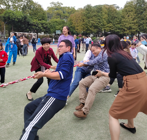 随着哨声吹响,老师们手握长绳,憋红了脸,铆足了劲奋力往后拉,现场人头攒动,呐喊声、加油声、欢呼声此起彼伏,一次次将比赛推向高潮。