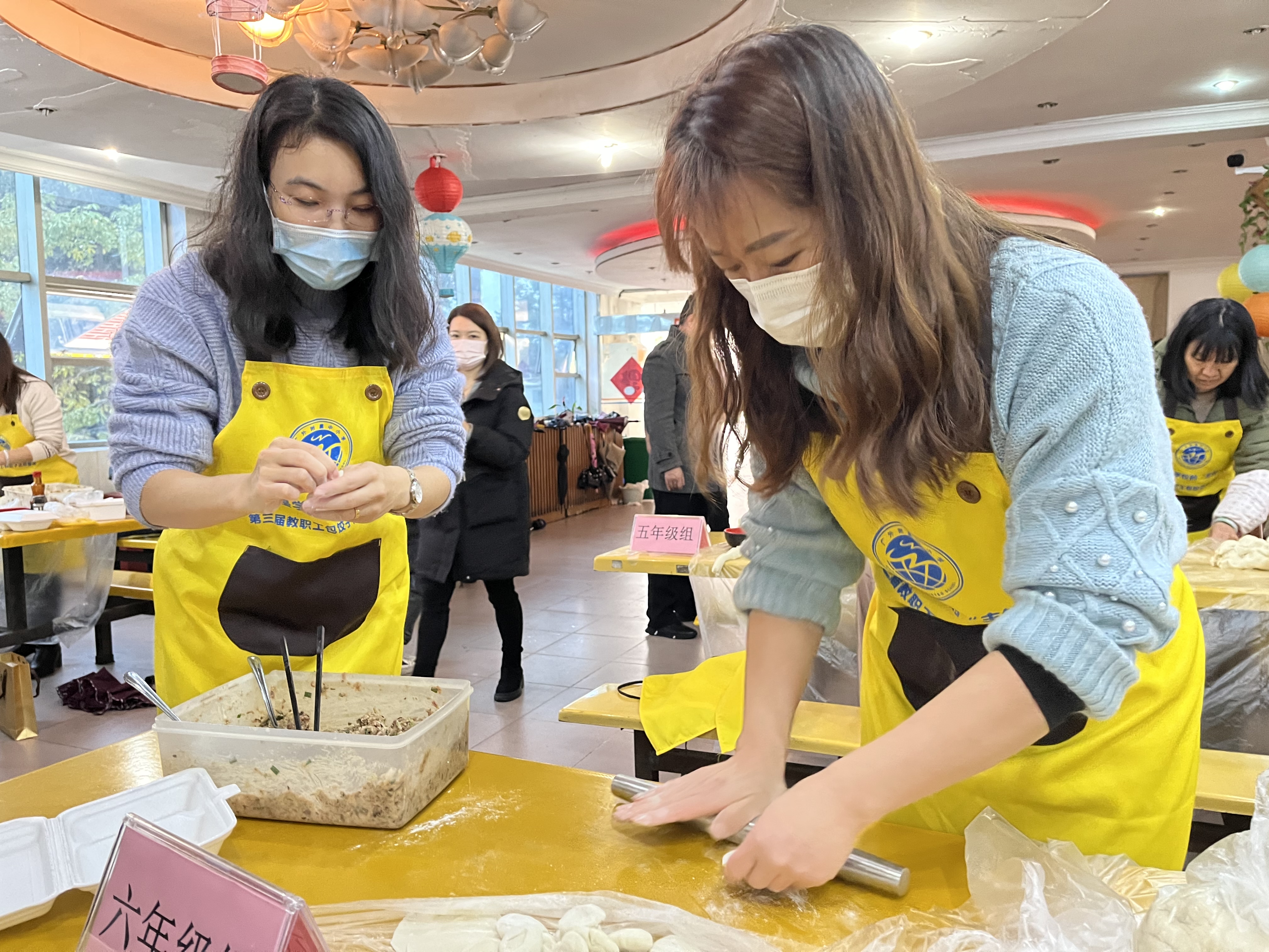 10:15,比赛正式开始。只见各组人员分工明确,调馅、揉面、擀皮儿、包饺子、摆盘等工序有条不紊。活动现场气氛热烈,附校的老师们不仅上得了课堂,而且下得了厨房,大家纷纷亮出绝活。看,她们动作娴熟,馅一放,手一捏,一个寓意吉祥如意、财源滚滚的元宝饺子就完成了;有的包了弯弯的月牙饺子,寓意着花好月圆......不一会儿,就像变戏法似的,一个个形态各异的饺子如“士兵”般排排站立,颇有“一声令下,勇往直前”之势。