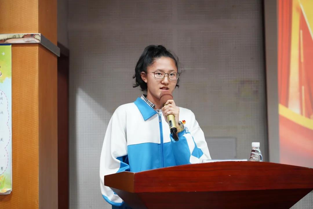 中学学生会副主席黄楚怡作为学生代表进行发言。首先,她对学校给学生们提供实现权利的平台表示感谢。并请在座的每一位代表都能行使好自己手中这份来之不易的权力,积极团结,为学校的民主治校出谋献策。