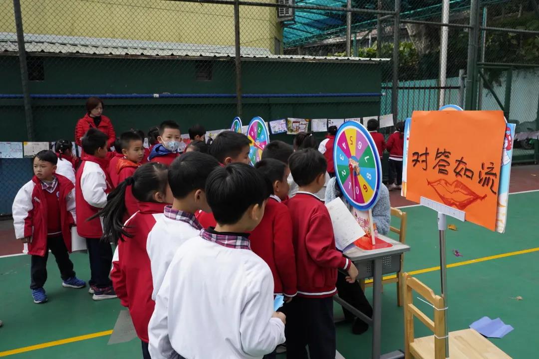 “对答如流”板块可以看出孩子们非常熟悉我们的课文,能够熟练背诵要求背诵的篇目:小朋友们一个个胸有成竹,自信大方,游戏转盘、取号背诵。很多人还依据课文内容附加了相应的动作,稚嫩悦耳的童声不时地回响在篮球场。