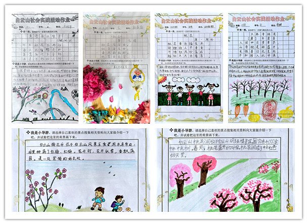 白云山实践活动锻炼体魄,拓宽视野,同学们在自由、轻松的环境中,感受着人与自然的和谐;在老师们的带领下,体会到悠悠白云山的深厚底蕴,感受大自然赠予岭南的宝贵财富,领略白云山作为广州精神象征的风采。实践活动结束后各班认真完成了实践作业,一年级的花瓣树叶书签,二年级我是小导游美景绘图,中高年级的实践探究报告,有内容、有深度、有质量。