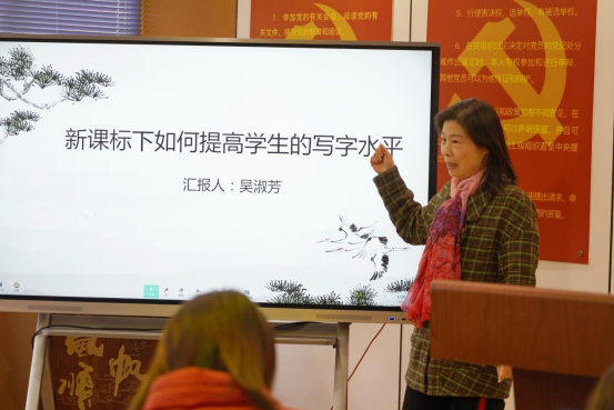 一年级组吴淑芳老师从要求、意义、问题、方法四个层面,对新课标下如何提高学生的写字水平做了汇报。吴老师认为,新课标下的写字目标不只在语文学科有要求,在艺术课程中也有体现;写字能表现一个人的文化底蕴、学识水平、审美素养和艺术品位;面对学生中出现的各种书写问题需要细心、耐心地去引导;可以带学生认识汉字,了解汉字背后的故事,老师也可以在学生中树立榜样,还可以立足课本、字帖做好指导……