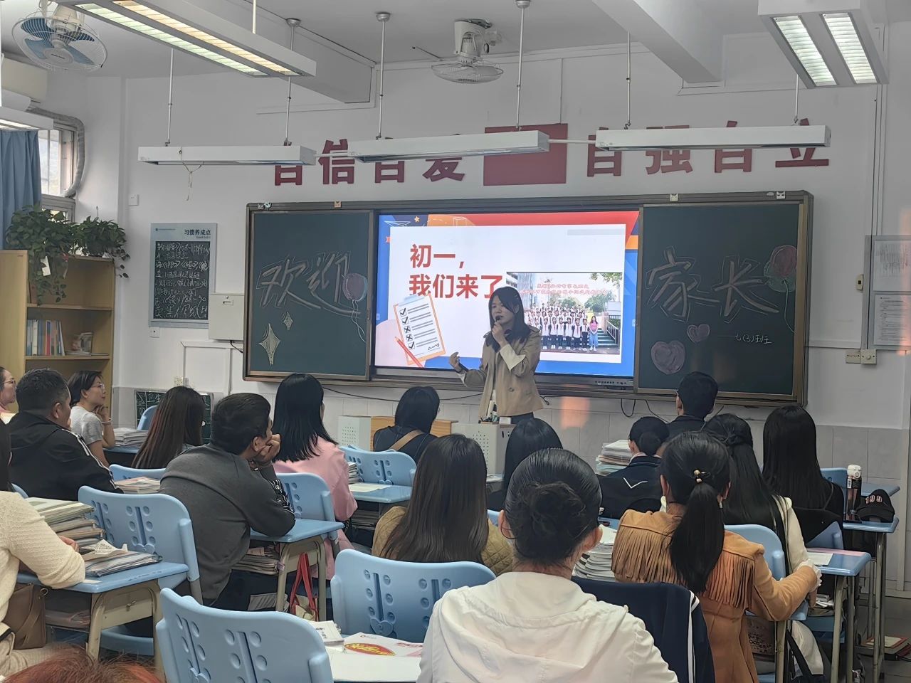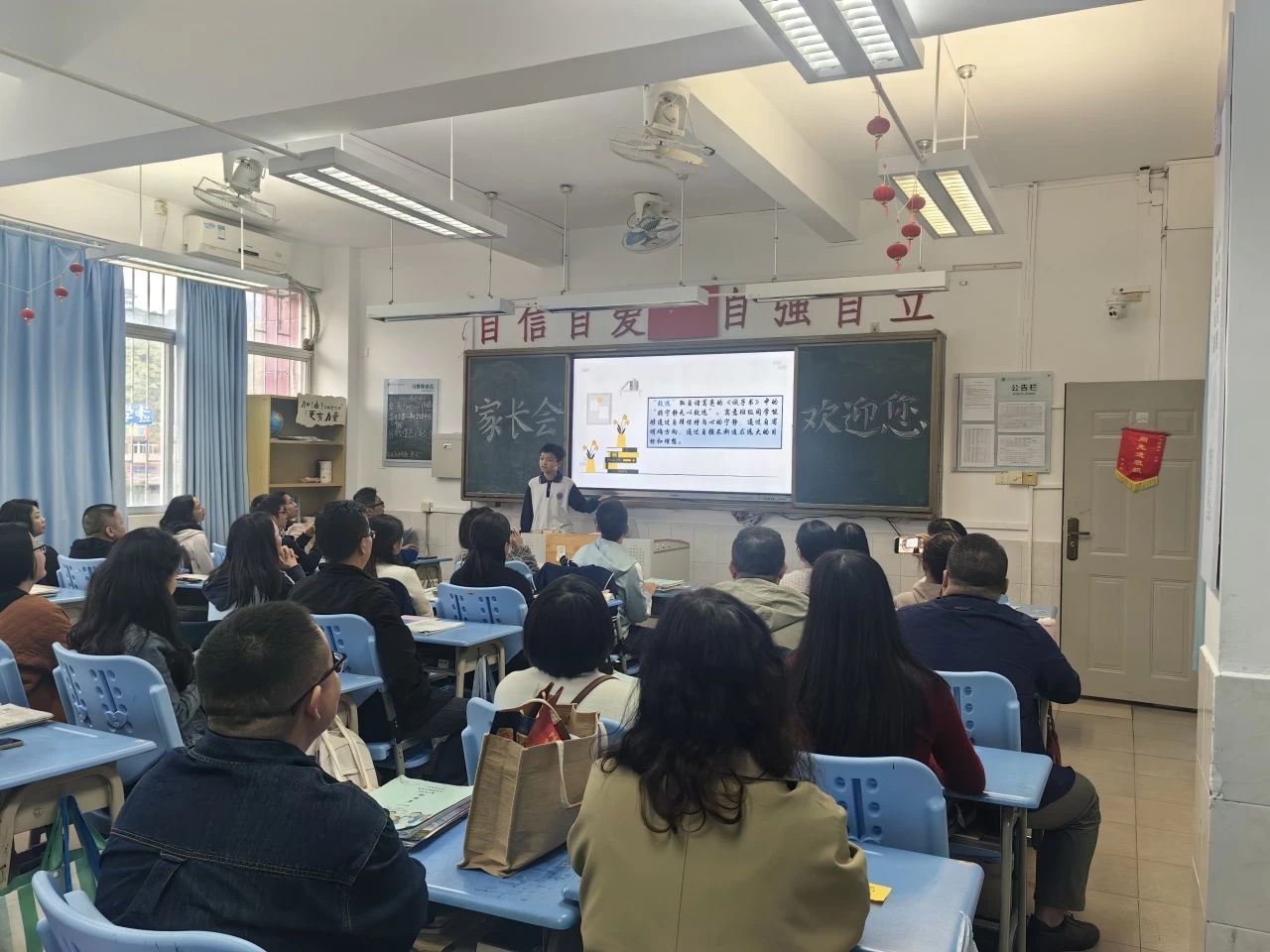 年段会议结束后,家长们移步到各班级教室。班级家长会上,学生落落大方的主持,班主任们就开学以来班级各项工作的开展情况、班级管理、学生近期的表现向家长们进行介绍与分享,分析了孩子们存在的问题,明确了今后学校教育和家庭教育的重点。学科教师分别从期中训练情况、中考形势、学习经验进行了分析。让家长明确初中阶段各学科学习的要求和目标,同时了解到孩子当前知识的薄弱点,并且给出了具体的、有针对性的措施和建议。帮助孩子们顺利地适应从小学到初中的巨大变化。