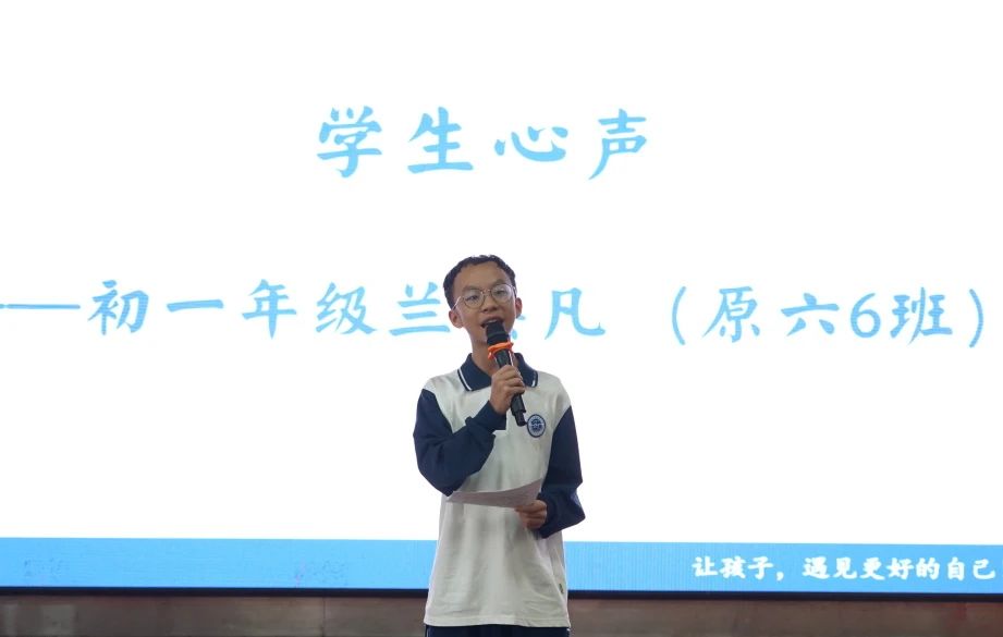 随后,初一学生代表上台发言,从自身经历出发,阐述了小学与初中的区别,分享了适应新阶段学习生活的心得体会,引起了在场家长的共鸣。