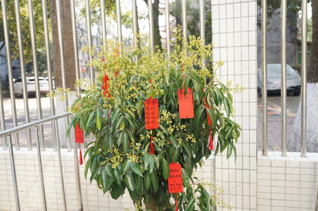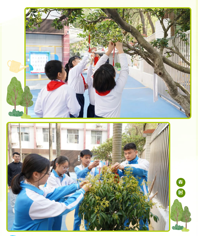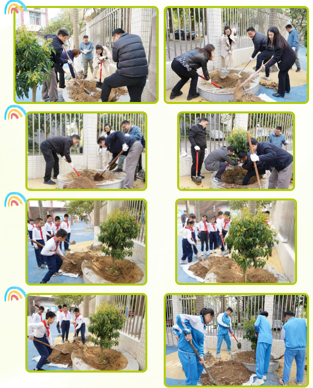 活动现场,教职工党员、团员代表以及少先队员代表分工合作,共同种下一颗“励志树”。党员教师们率先撸起袖子完成挖坑任务,21 名少先队员也热情高涨,积极参与填土、浇水等辅助工作,5 名初中生团员充分发挥体力优势,承担起最后的填土压实的任务。过程紧张而有序,在党员、团员和少先队员默契配合下,植树任务完成快速,一棵承载着希望的荔枝树稳稳扎根在校园土地上。