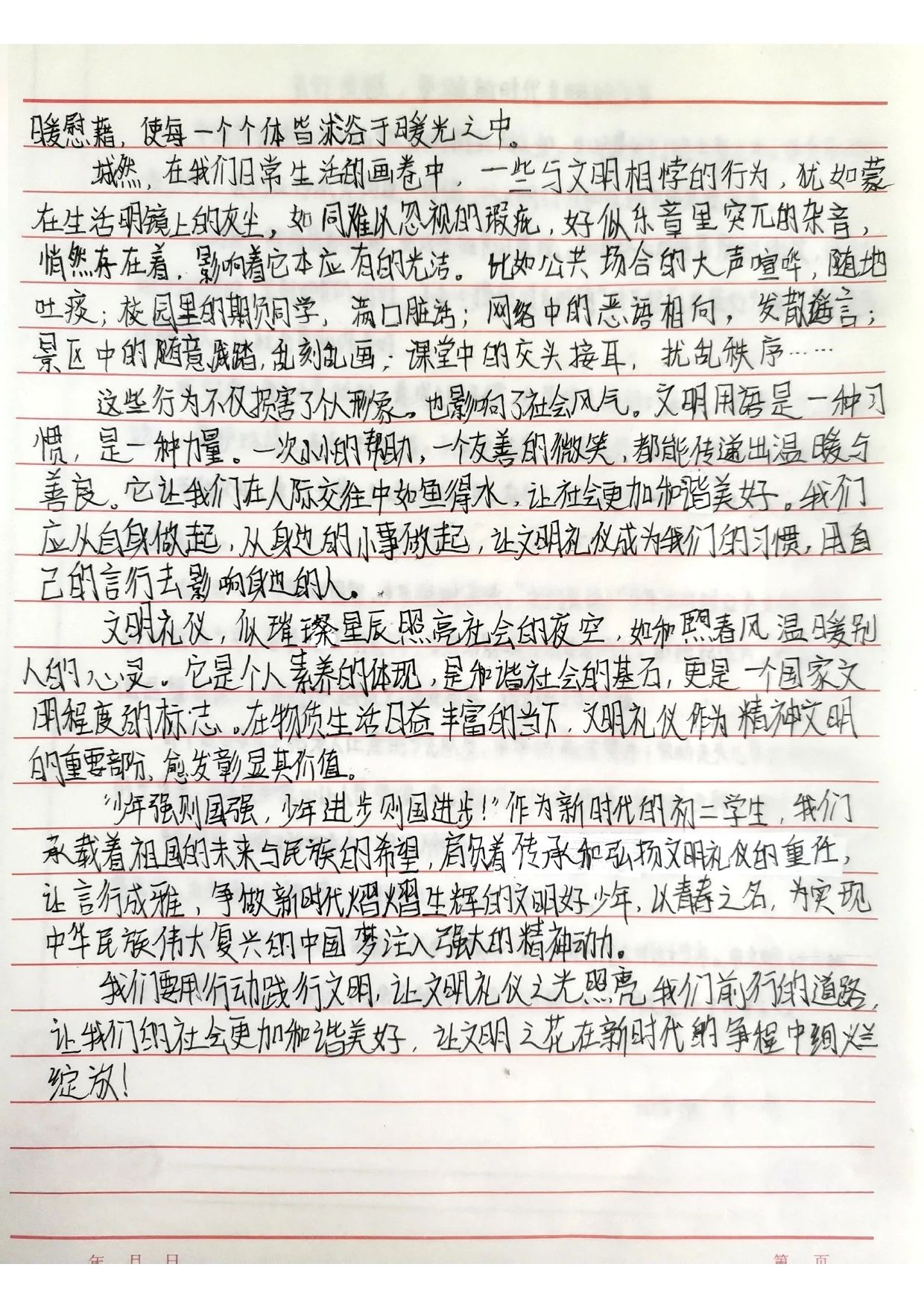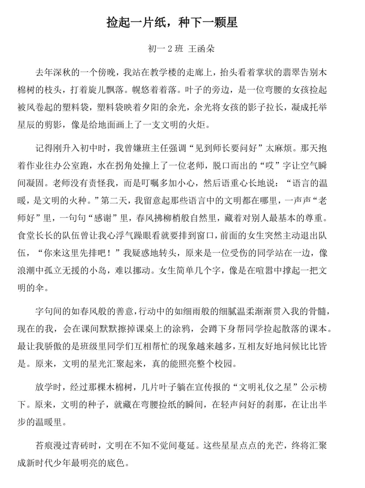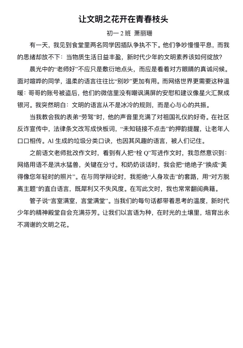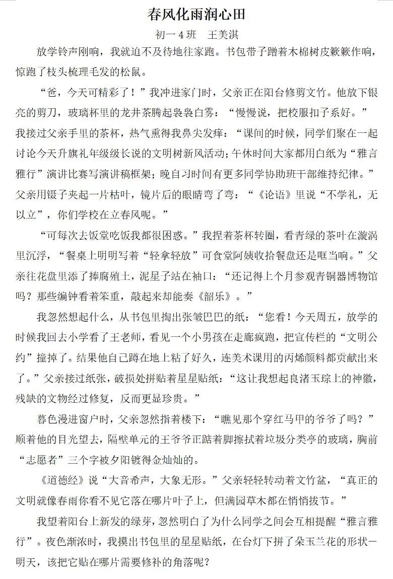在获奖作品中,既有以校园生活视角记录文明细节的《捡起一片纸,种下一颗星》,也有引经据典探讨礼仪传承的《雅言润心,雅行致远》;七年级学生以《让文明之花开在青春枝头》讲述校园礼仪教育,八年级学生则用《携手共进,言行成雅》呼吁于细节入手,从小事做起践行文明修养。这些作品将抽象的道德准则转化为鲜活的生活场景,体现了同学们对文明礼仪的独特诠释,更彰显了作为新时代少年传承美德、共建和谐社会的责任感与担当。