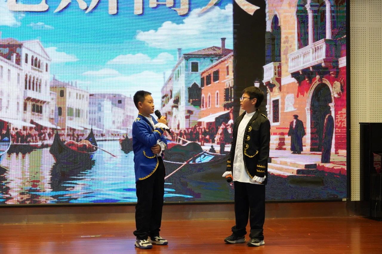 五(6)班带来的绘本剧是《The Merchant Of Venice》。在威尼斯的一座桥上,陈利垚扮演的Bassanio和冯劲博扮演的Antonio一起去找钟紫梒扮演 Shylock借钱求婚。Shylock提出,如果 Antonio没能及时还清债款,就要从他身上最接近心脏的地方割下一磅肉。最后,Bassanio求婚成功,Antonio却没能及时还清钱。高乐希扮演的Porsia帮助 Antonio赢得了官司,保住了性命。