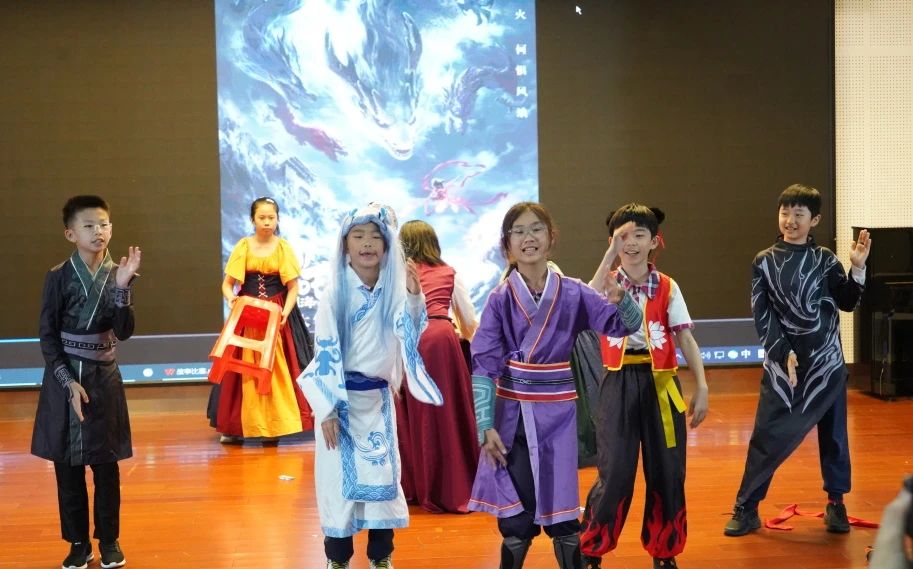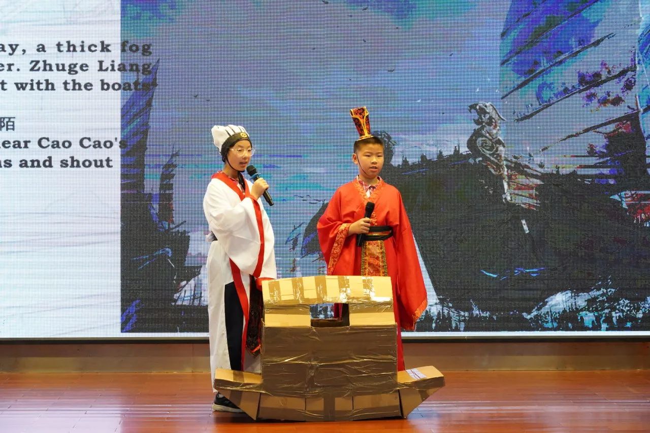五年级各班的同学们表现都十分亮眼。五(1)班选择经典故事《草船借箭》参赛。为更好地展现故事内容,同学们精心准备了契合角色的服装,力求生动还原古人风貌。值得一提的是,大家还亲自动手制作了 “战船” 道具,细节之处尽显用心。凭借这份对比赛的热忱与认真,五(1)班同学在比赛中大放异彩,为观众带来了一场别开生面的视听盛宴。