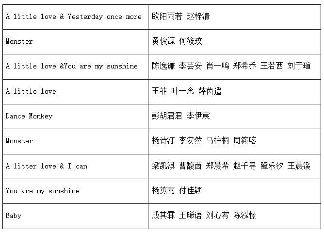 经过评委们的认真评选,本次歌唱比赛分别评选出一等奖、二等奖若干名。获奖选手们用他们的才华和努力,赢得了荣誉和掌声。同时,本次活动也充分展示了二年级学生的英语水平和艺术才华,为校园文化建设增添了浓墨重彩的一笔。
