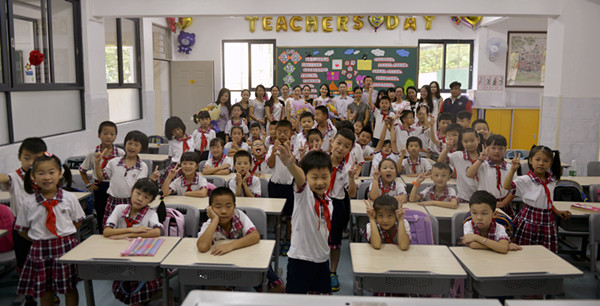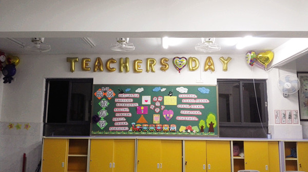 本网讯9月10日,二年2班的教室焕然一新,教室后墙版报上粘贴了温馨的节日祝福语和小朋友们精美的贺卡。版报上方金色的英文字母:Teacher's day、角落里各色可爱的气球、黑板上写着“感恩教师节”……整个教室洋溢着浓浓的节日气氛。这天早上,孩子们把所有的任课老师邀请到了教室,举行了一个简单而又热烈的祝福感恩活动。