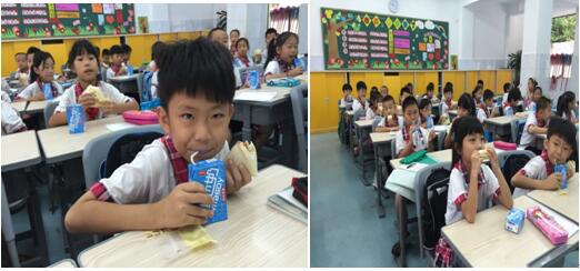 本网讯中小学生如果没有吃早餐或早餐吃的质量不够好,那么到了上午10点多钟就会感到饥饿,出现乏力、注意力下降,不能够专心听讲,影响听课的效果,长此以往会影响学习成绩。此时加点课间餐有利于补充能量并消除饥饿感,保持体力充沛,便于更好地完成上午的学习任务。但是为了让课间餐既能起到恢复体力的作用,又不至于影响午餐的胃口,理想的课间餐是谷类食品和奶制品。广外附属中小学全体学生在校长和书记的全力关怀下,今天起开始为学生增加课间餐维他奶和蛋糕,我校共有1200多名学生吃到课间餐。