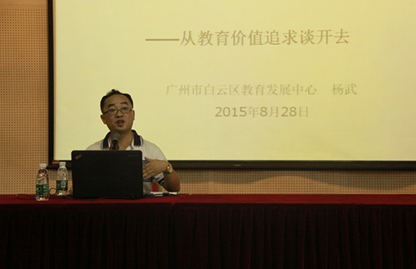 讲座会上,杨武副主任以《静听花开的声音——从教育价值追求谈开去》为题展开本次培训演讲。他从“工具论”、“理想论”、“追求价值的教育实践”、“优化生态”等多个方面对教育的价值进行了深入的探究。他讲到教育的价值在于为社会培养合格的公民与建设者,社会的需要不仅为人的需要,亦为教育的需要。教育应以培养完善的个人为旨趣,以满足每一个个人的内在需要为目的。并用一个个鲜活的案例和自己独到的见解,毫无保留地和老师们分享了自己潜心钻研的德育研究成果,赢得了在座各位老师的热烈掌声。